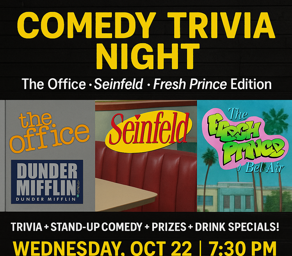 Join us at Upstage Comedy Lounge for Comedy Trivia Night: The Office • Seinfeld • Fresh Prince Edition — a hilarious mashup of stand-up comedy and live trivia featuring your favorite sitcoms!