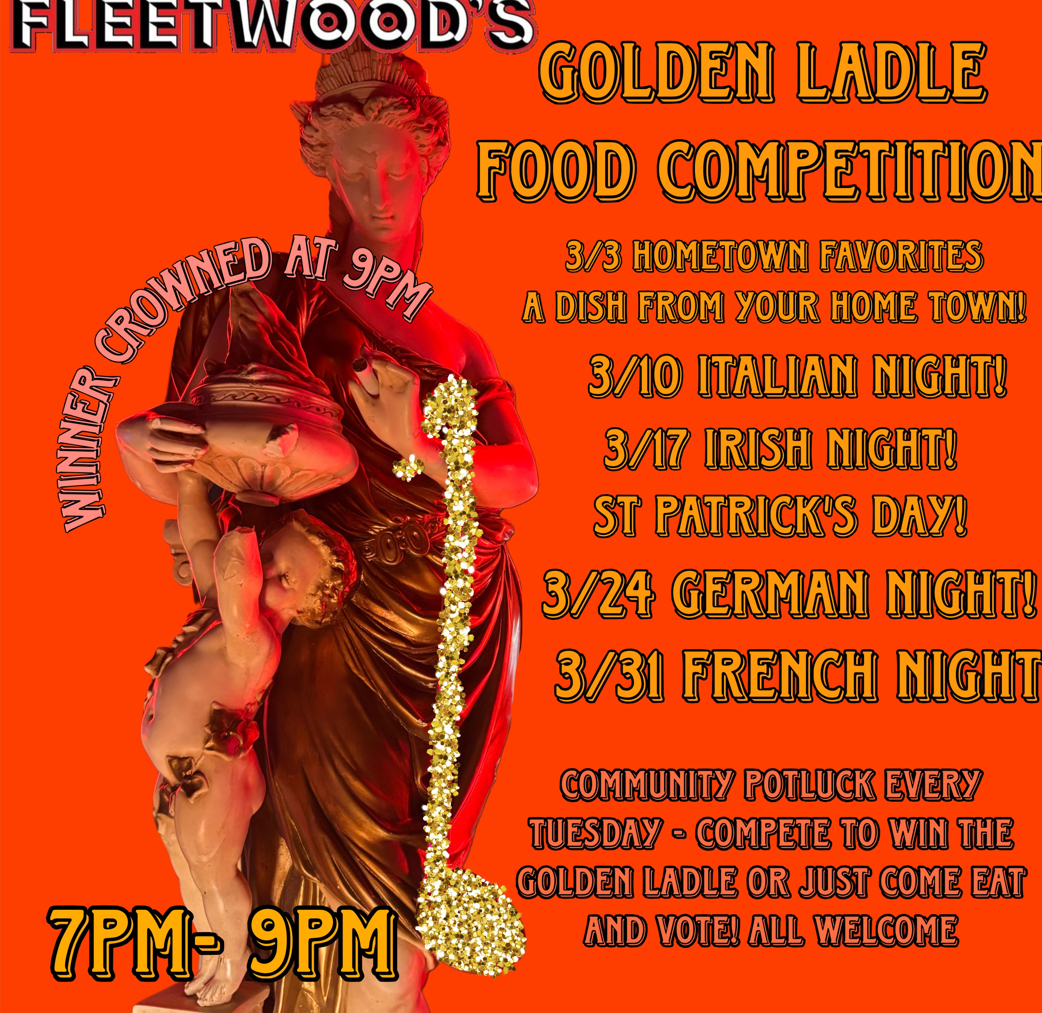 Every Tuesday in March we are continuing our "Golden Ladel" food competion. Come to competeor just eat (and judge).