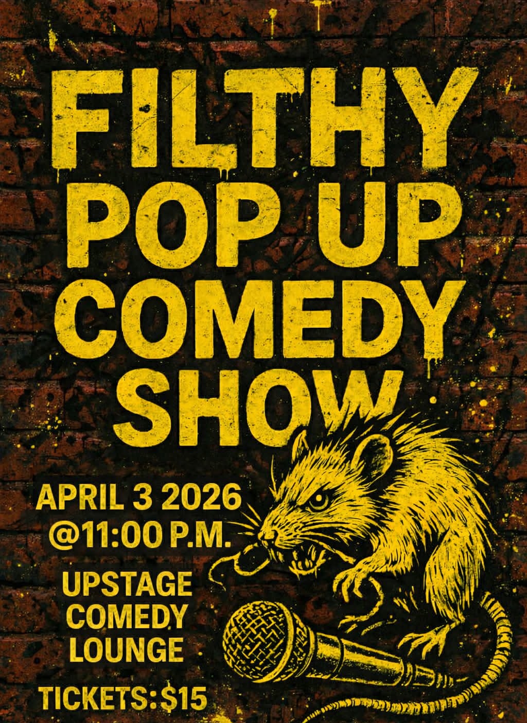 Looking for comedy that doesn’t play it safe? Welcome to The Filthy Pop-Up Show, where the jokes are raw, the topics are taboo, and nothing is off-limits. This is the night for people who love their comedy unfiltered, non-PC, raunchy, and real. Expect outrageous stories, wild punchlines, and comics who aren’t afraid to go there. If you like your laughs dirty and your humor bold, this is the show you don’t want to miss. Come out, grab a drink, and let loose!