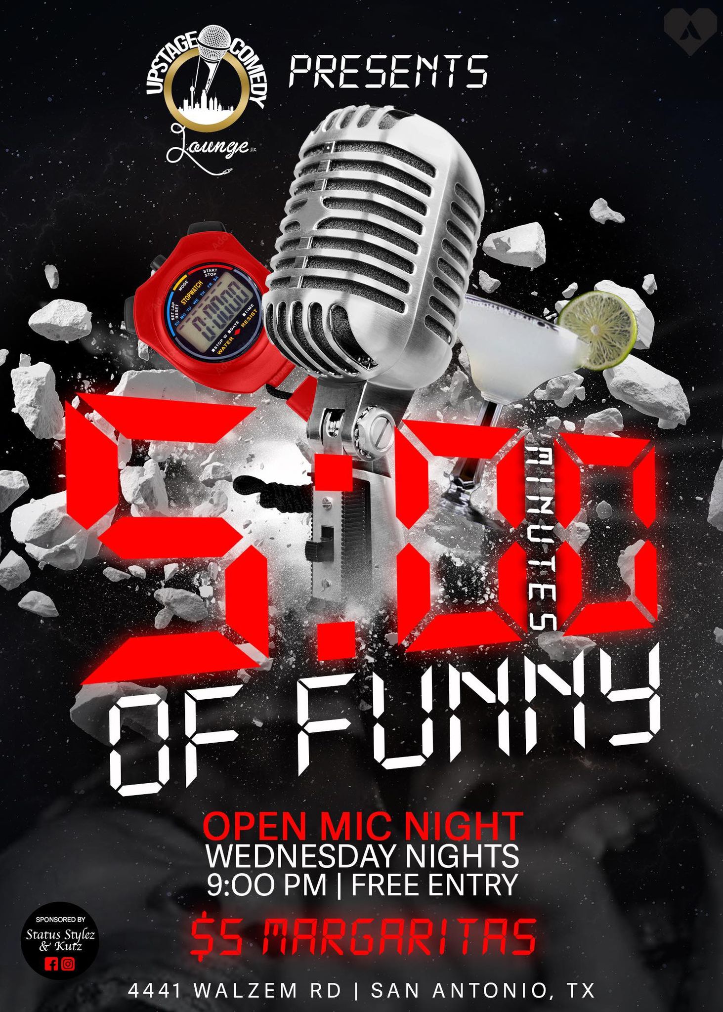 Get ready to laugh your heart out at the "5 Mins of Funny" Wednesday Open Mic event! Join us on Wednesday, at 9:00 PM (CDT) at 4441 Walzem Road, San Antonio, TX 78218.