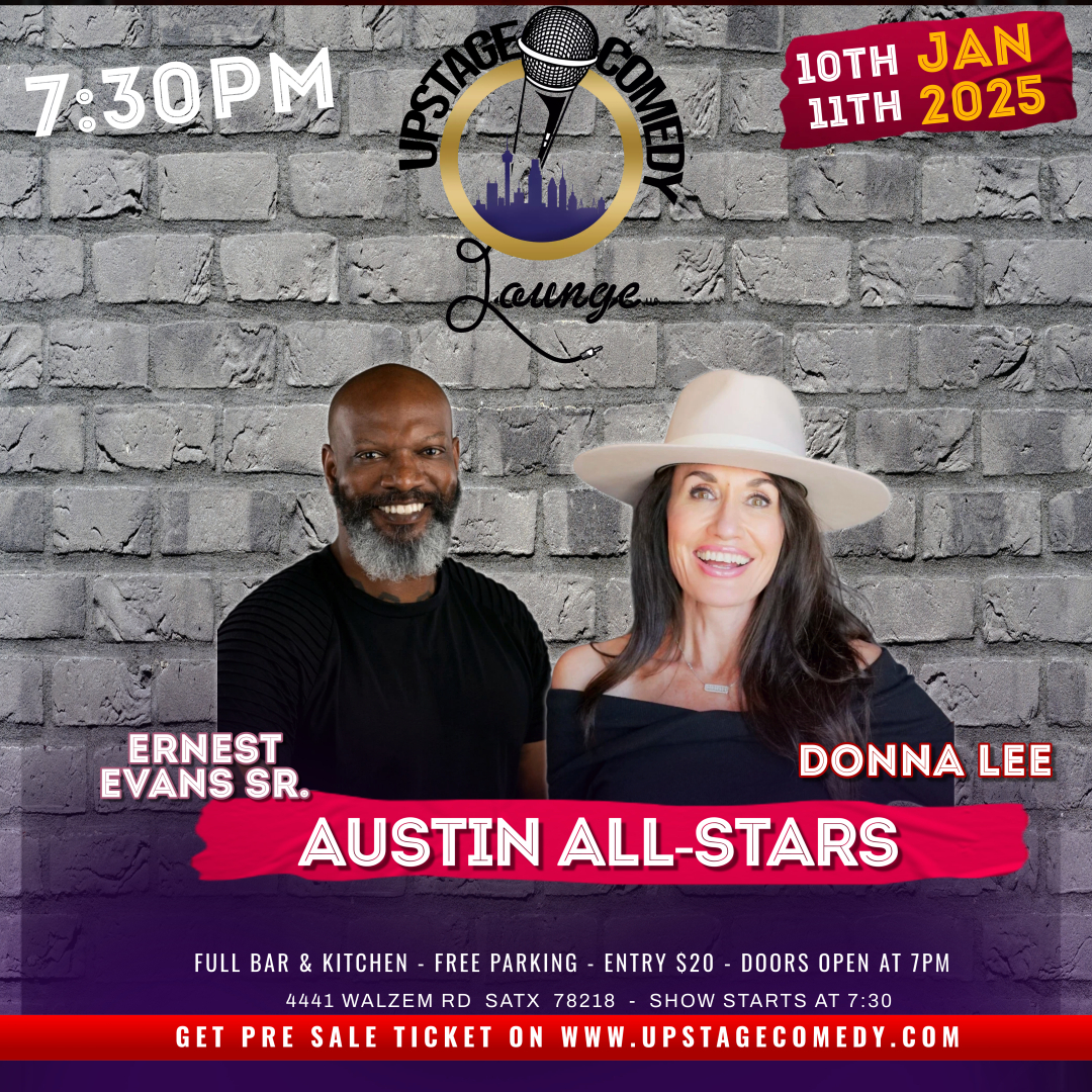 Experience the best of Austin’s comedy scene as Ernest Evans Sr. and Donna Lee take the stage for the Austin All-Stars Comedy Show! Join us on January 10th and 11th, 2025, at 7:30 PM for two nights of uproarious laughter at Upstage Comedy Lounge. These all-star comedians bring their unique styles ..Experience the best of Austin’s comedy scene as Ernest Evans Sr. and Donna Lee take the stage for the Austin All-Stars Comedy Show! Join us on January 10th and 11th, 2025, at 7:30 PM for two nights of uproarious laughter at Upstage Comedy Lounge. These all-star comedians bring their unique styles and unforgettable humor to San Antonio, promising a show you won't want to miss. Enjoy the full bar and kitchen, with free parking available for your convenience. Tickets are $20, with doors opening at 7 PM. Located at 4441 Walzem Rd, San Antonio, TX 78218, this is the perfect way to kick off your new year. Grab your tickets now at www.UpstageComedy.com and get ready for a stellar night of comedy!