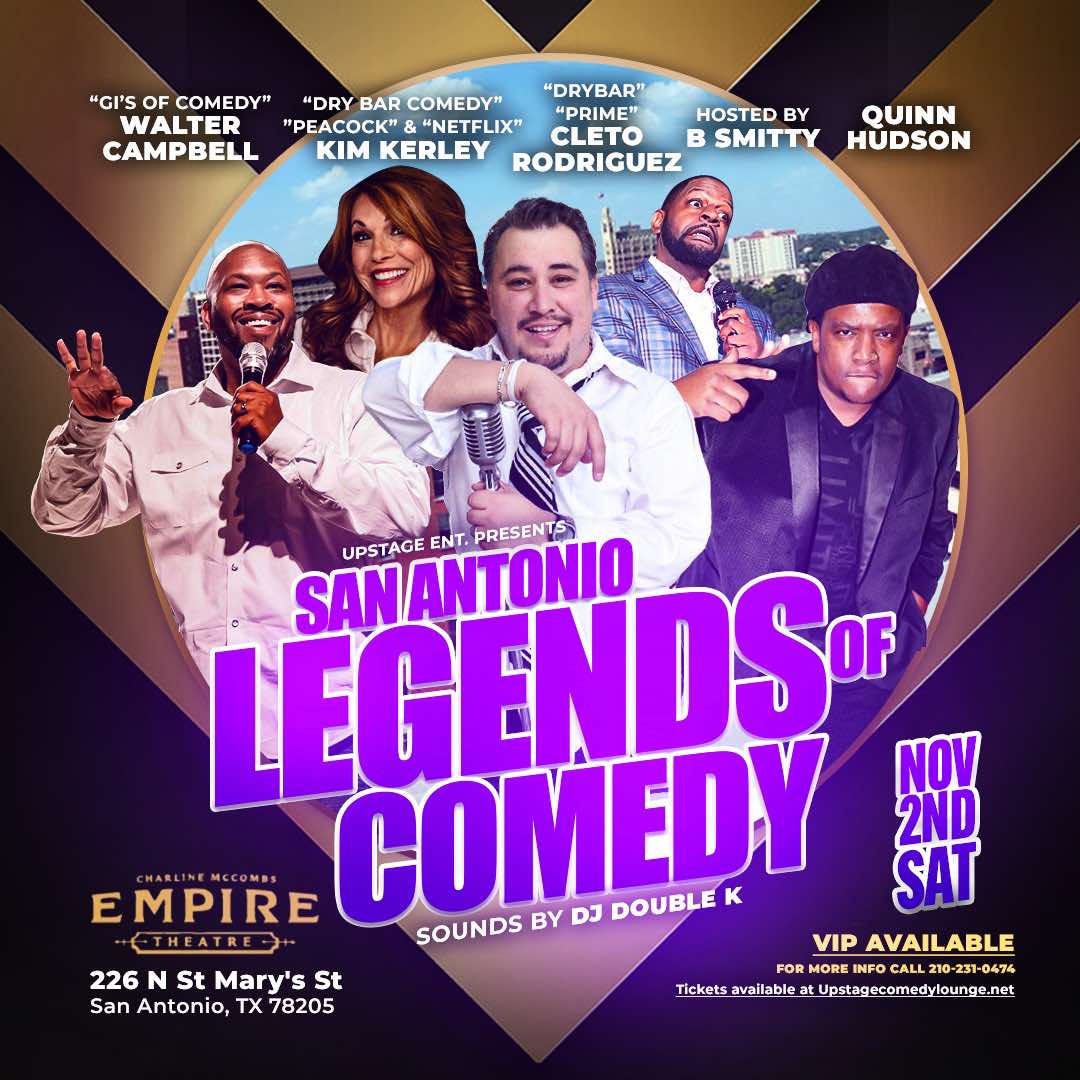 Get ready for an electrifying night of comedy at the Empire Theatre on November 2nd! Upstage Ent. presents the San Antonio Comedy Legenddds, featuring a stellar lineup of the funniest comedians in the area. Headlining the show is the sensational Cleto Rodriguez, hosted by the hilarious B Smitty. Our incredible lineup includes Jesse Pangelinan, Walter Campbell, Quinn Hudson, Kim Kerley all bringing their unique and side-splitting humor to the stage. With sounds by DJ Double K, this night promises to be one you won't forget.