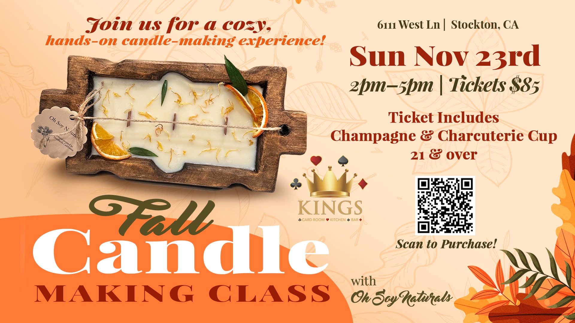Join us for a cozy Friendsgiving-inspired afternoon on the Kings Patio! On Saturday, November 23rd from 2PM–5PM, Oh Soy Naturals will guide you through a hands-on candle making class where you’ll create your own custom fall-scented candle.