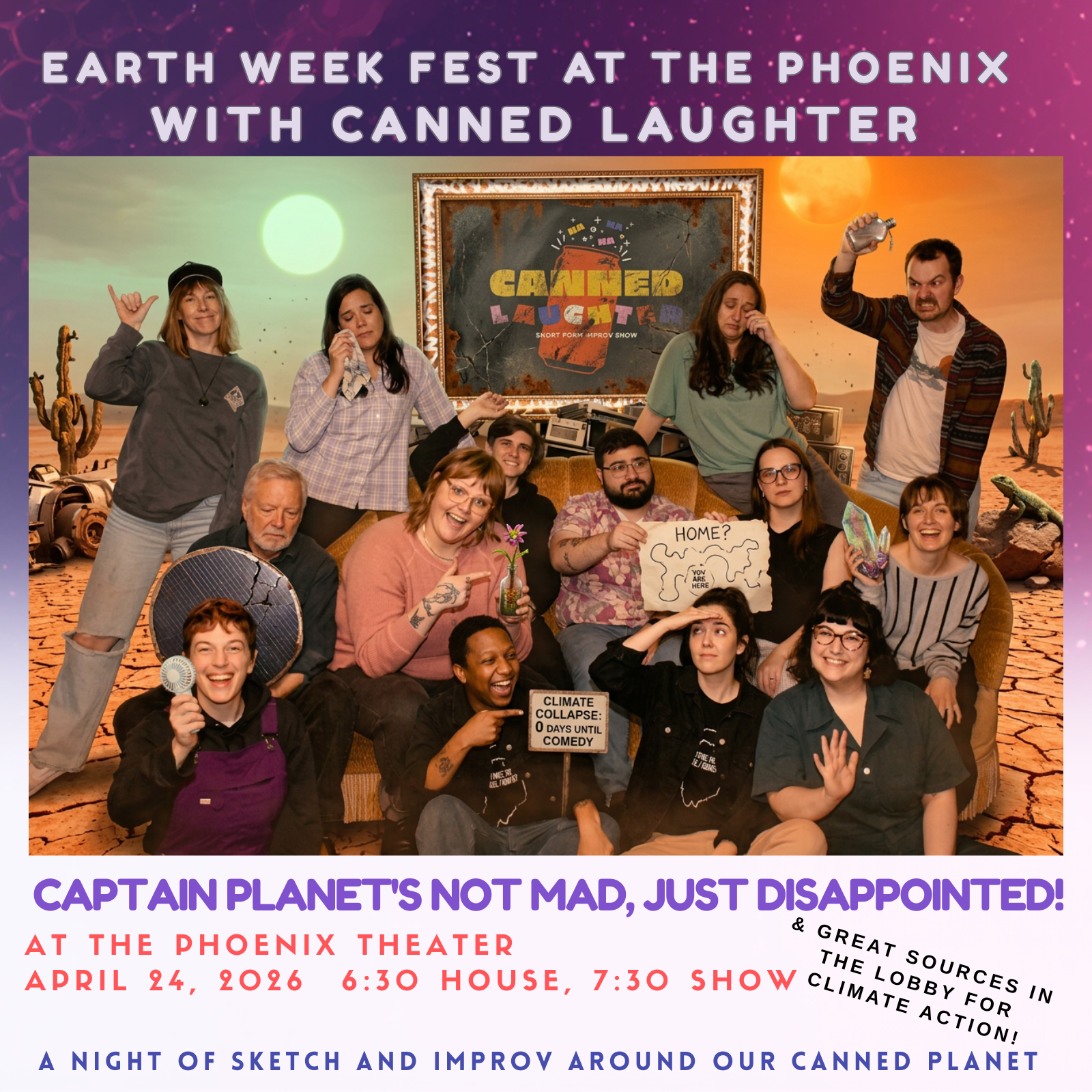 Sketch & Improv on the Climate. It's a Canned Earth afterall... Great Improv artists and writers bring us the laughter around a slightly confused planet for the night.