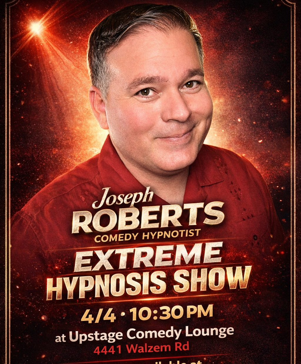 Get ready for a night you won’t forget! Hypnotist Joseph Roberts is back at Upstage Comedy Lounge on Saturday, April 4th with his Extreme Comedy Hypnosis Show! Watch as ordinary people become the stars in a fast-paced, hilarious, and totally unpredictable experience. One show only at 10:30 PM—so grab your late-night crew and come ready to laugh, cheer, and get wild!