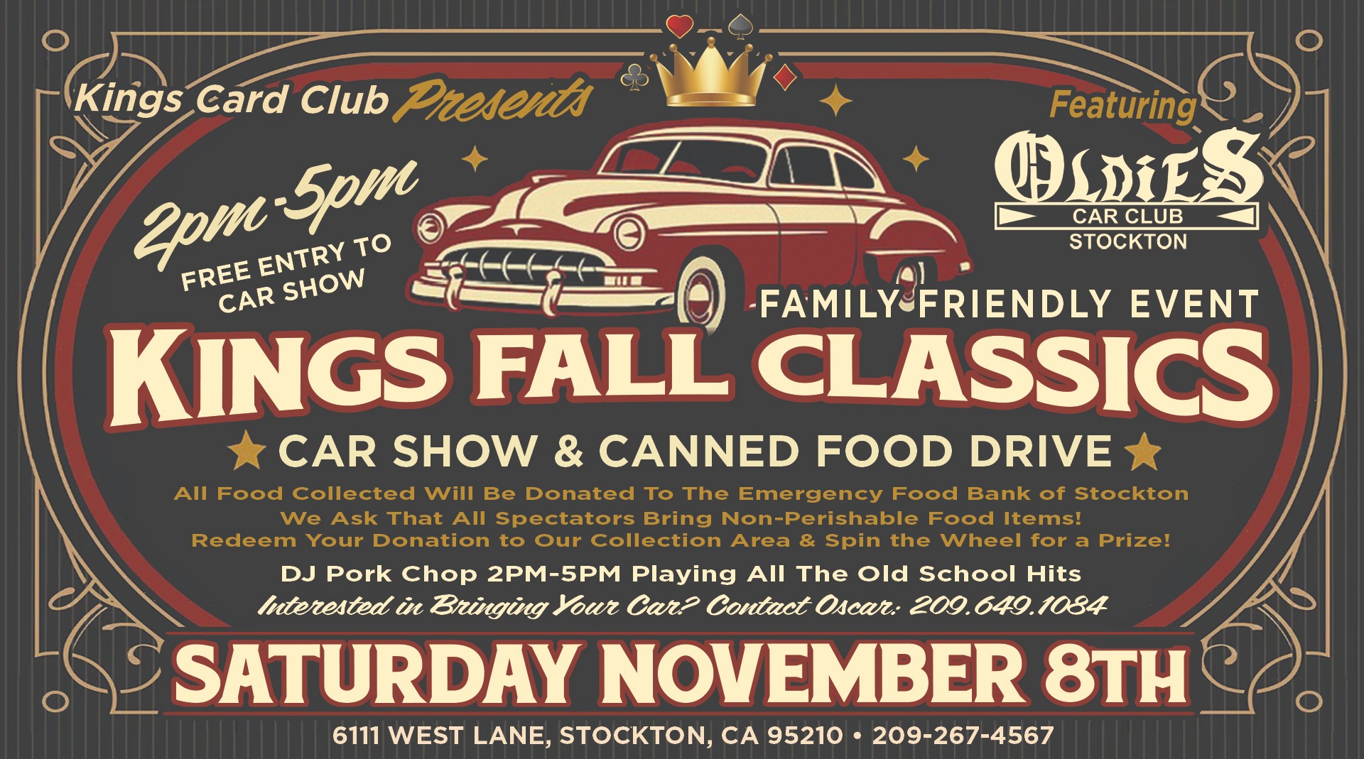 Join us for Kings Fall Classic Car Show and Canned Food Drive on Saturday, November 8th from 2PM to 5PM at Kings Card Club in Stockton! In collaboration with the Oldies Car Club, this family friendly event is a celebration of timeless cars, good vibes, and great company. Enjoy free entry to stroll through a lineup of stunning classic vehicles, we just ask that all spectators bring non-perishable canned food items! Redeem your donation to our collection area & spin the wheel for a prize! It’s the perfect Fall Saturday for car lovers, music fans, and anyone looking for something fun and nostalgic. See you there!