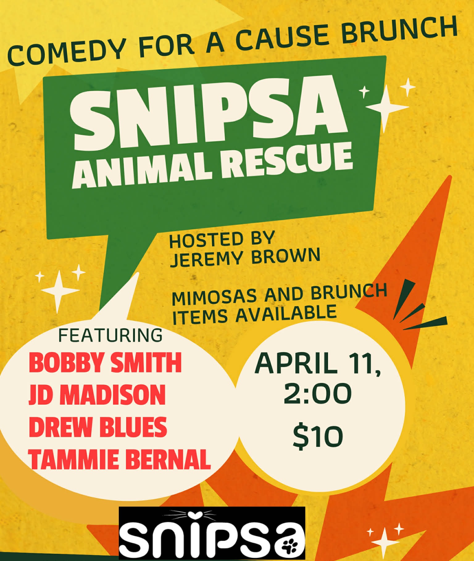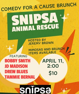 Join us for an afternoon of laughs for a great cause at Upstage Comedy Lounge. This special comedy fundraiser benefits SNIPSA Animal Rescue and features a fun lineup of comedians, all hosted by Jeremy Brown.