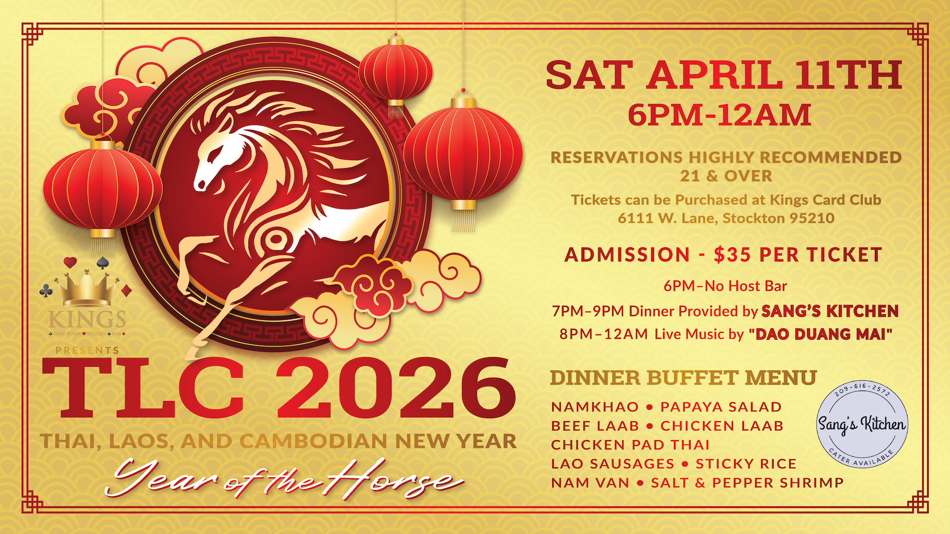 Join us for TLC 2026 starting at 6 PM for a night featuring a delicious dinner buffet by Sang’s Kitchen and live music by "Dao Duang Mai." Tickets are just $35, stop by Kings to grab yours and secure your reservation for this annual event!